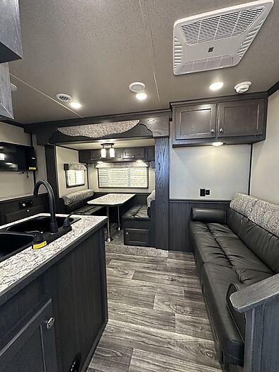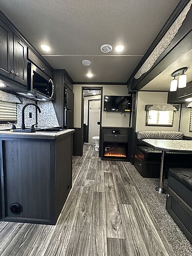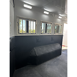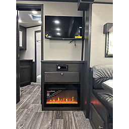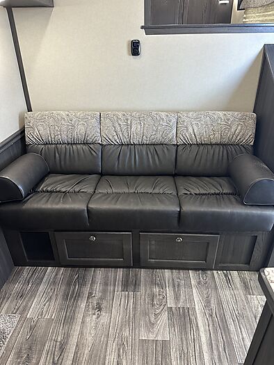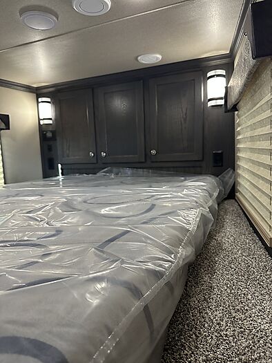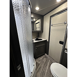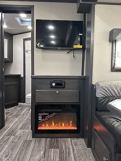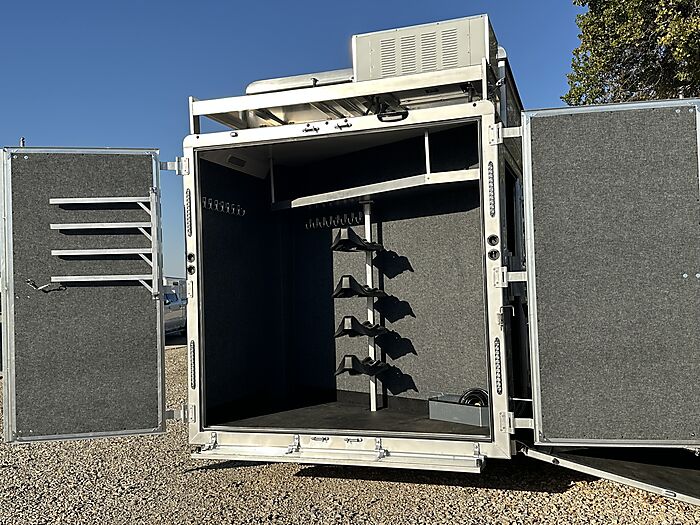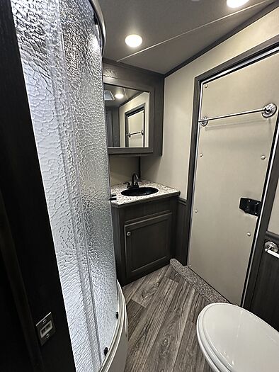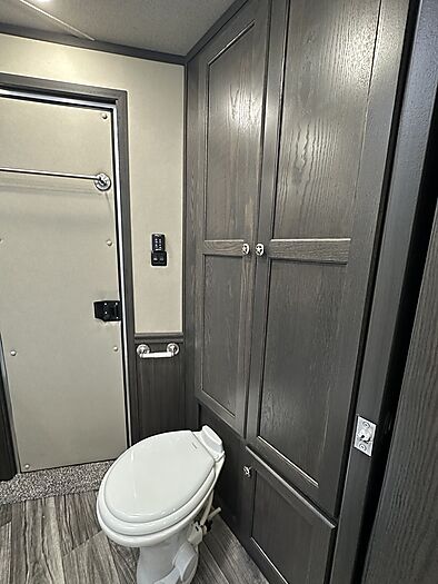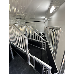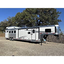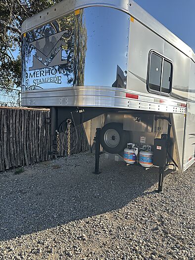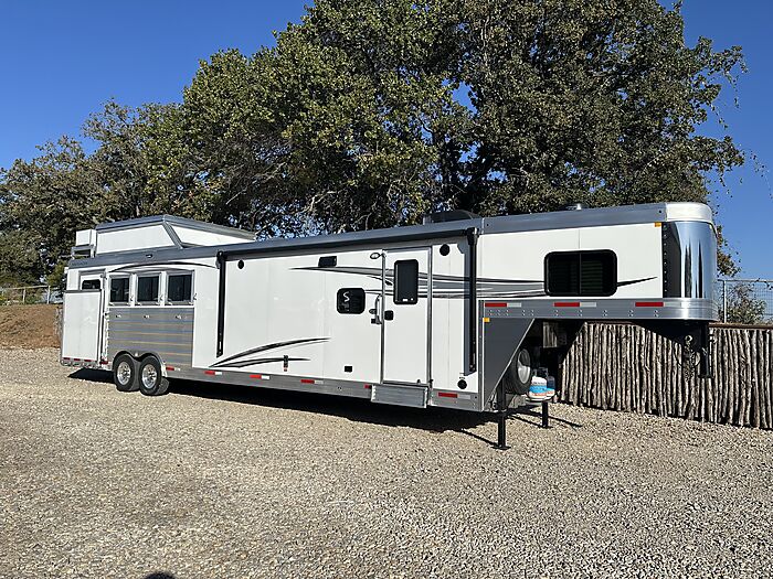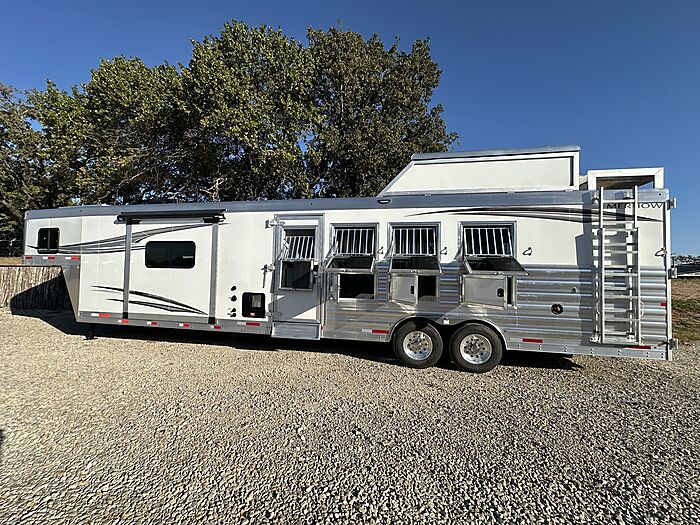 2026 Merhow 4 Horse P/C load Stampede 8414 = 34'6" Floor length x 8' Wide x 7'6" Tall, 8k torsion axles, Electric brakes, ST215/75R17.5 tires, Aluminum wheels, Spare tire, Dual leg hydraulic jack, Aluminum battery box, Dual propane bottles, Hay pod with deck and pull-out ladder, Onan 4.0 generator, Mangers, Drop down windows on both head and hip sides, P/C load with cleated ramp, Full rear tack, 4 Saddle racks, Swining 4 bar pad rack, Brush tray, Shelf, Bridle hooks, Carpet lined walls in rear tack, Poured floor, Lined and insulated in horse stalls, Padded dividers, Stud divider on first stall, Stamped 8414 living quarters,14'6" short wall, Electric 6' slide out (full dinette), Sofa sleeper leather couch, Arctic Teak cabinets, El Paso floor, Zilch linen wal color, Star Dune counter-tops, Fireplace, TV, Stereo, Awning, Porcelain toilet, 2 burner stove top, Refrigerator, Convection microwave, double-sided black kitchen sink, Black bathroom vanity, Black faucets throughout, 32" shower, Ducted heat/AC, 19,000 BTU LP Furnace, 15,000 BTU AC, 10-gal water heater, 200-watt solar panel, Walk thru door to horse compartment. This trailer is a must-see, and don't forget the Merhow 8-year structural warranty and 2-year LQ warranty. Stock # 31631