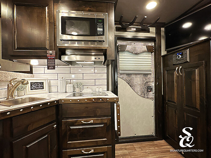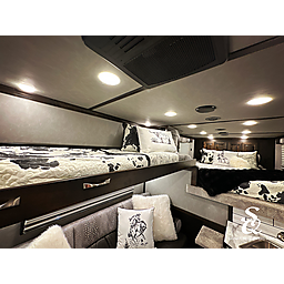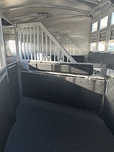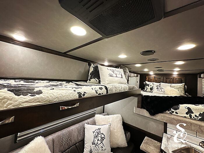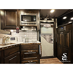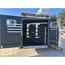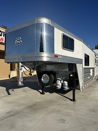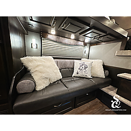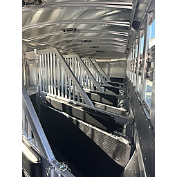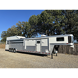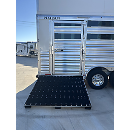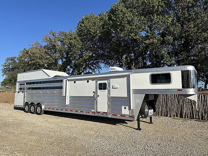New 2025 Platinum 6 horse with a 12'8" short wall - Signature Quarters interior = 39' Floor x 8' Wide x 7'6" Tall, 3 - 8k rubber torsion axles, 17.5" tires on Alcoa aluminum wheels, Spare tire, Electric brakes, Dual leg hydraulic jack, Aluminum battery box, Overmount intergrated 8' Hay pod with roof rack, 4000 Onan Generator, Drop down windows on the head and air gaps with plexiglass on hip, Mangers, Side load, Rubber lined walls, EquiFlex floor, Stud divider on first stall, Hanging mats on 4 dividers, Escape door, All padded flow-thru dividers, Full rear tack, 6 saddle racks, 3 corner shelves, One long shelf, 2 Brush trays, 6 blanket bars, 2 pair splint boot holders, 30 Bridle hooks, 12'8" short wall with Signature Quarters interior, Sleeper sofa, Fold down bunk (can easily be changed to cabinets only), 6.0 Refrigerator, Lots of closet space, Walk thru door, Convection micowave, Cooktop, TV, Stereo, Awning, Many more extras.