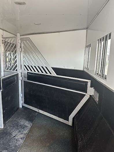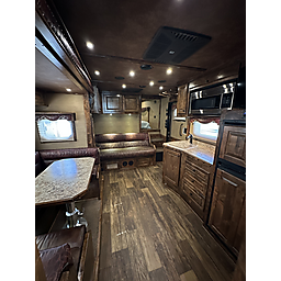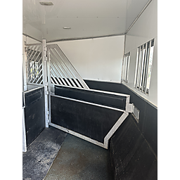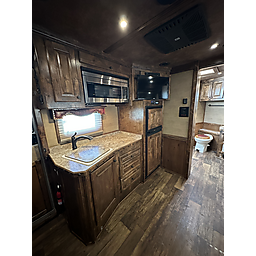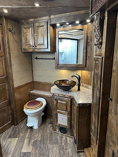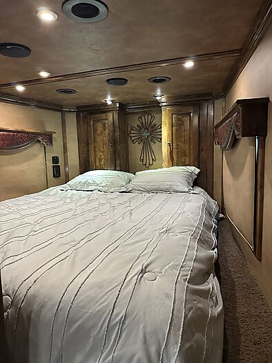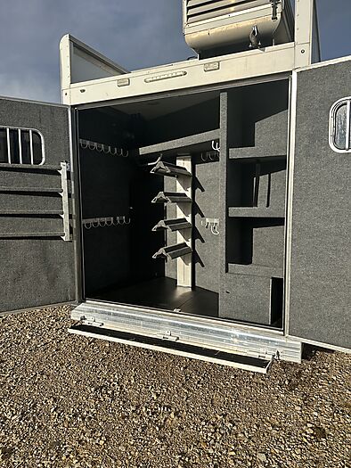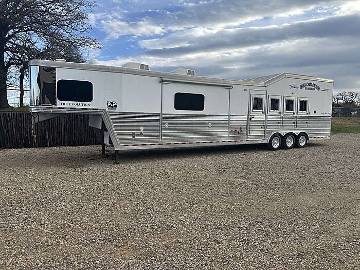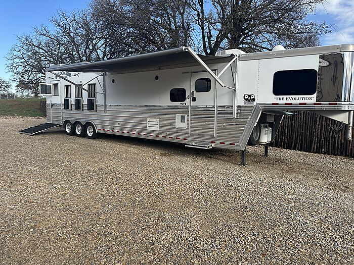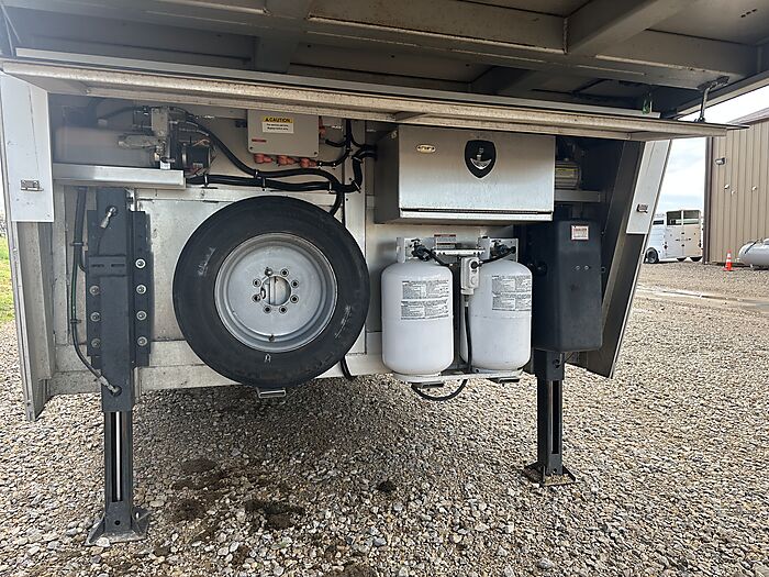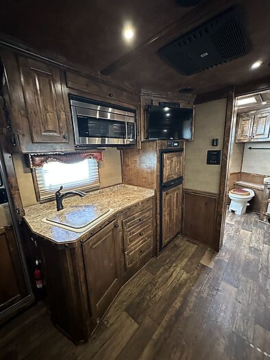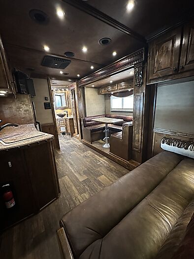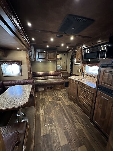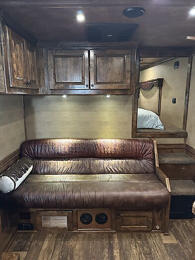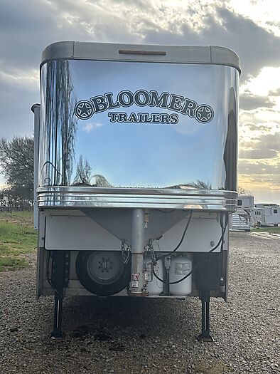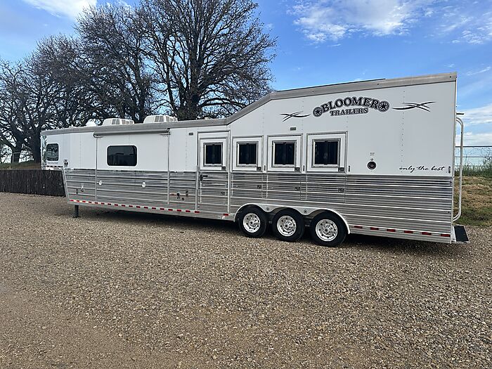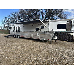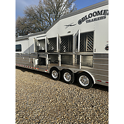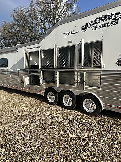 Consignment - 2018 4H Bloomer side load with 17' sw Outlaw interior = 36' on Floor x 8' Wide x 7'6" Tall, 7k rubber torsion tri-axle, 17.5" tires on Alcoa aluminum wheels, Spare tire, Dual leg hydraulic jack, Elec/Hyd brakes, 7kw Onan generator, Dual 30# propane bottles, Aluminum battery box, Integrated hay pod, Dual AC, 50 amp service, Lined and Insulated horse compartment, Poured floor, Side load, Mangers, Drop down windows on both the head and hip sides, Escape door, Full rear tack, Carpeted walls, 4 tier saddle rack, 36 Bridle hooks, Shelves, 4 Swinging blanket bars on door, 17' shortwall with a 10' hydraulic slide out, Outlaw interior, Aligator leather and accents, Leather couch and dinette, U-Shaped dinette, Porcelin sink and stool, Glass bowl bathroom sink, Anitique brass fictures, 2 large closets with dual clothes rods, Big bathroom, Beautiful cabinetry, Abundant storage, 2 burner cook top, Convection microwave, Refrigerator, 2 TV's, Stereo, Awning, Queen bed in nose, Ducted heat and air.